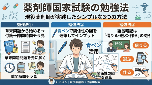 薬学部 「薬剤師国家試験の勉強法|現役薬剤師が実践したシンプルな3つの方法」 hiropon 薬とお金の研究所 「国試の勉強、何か特別なことをしないといけないのかな」 薬学部6年生になると、こういう不安に駆られることがあると思います。周りが難し …