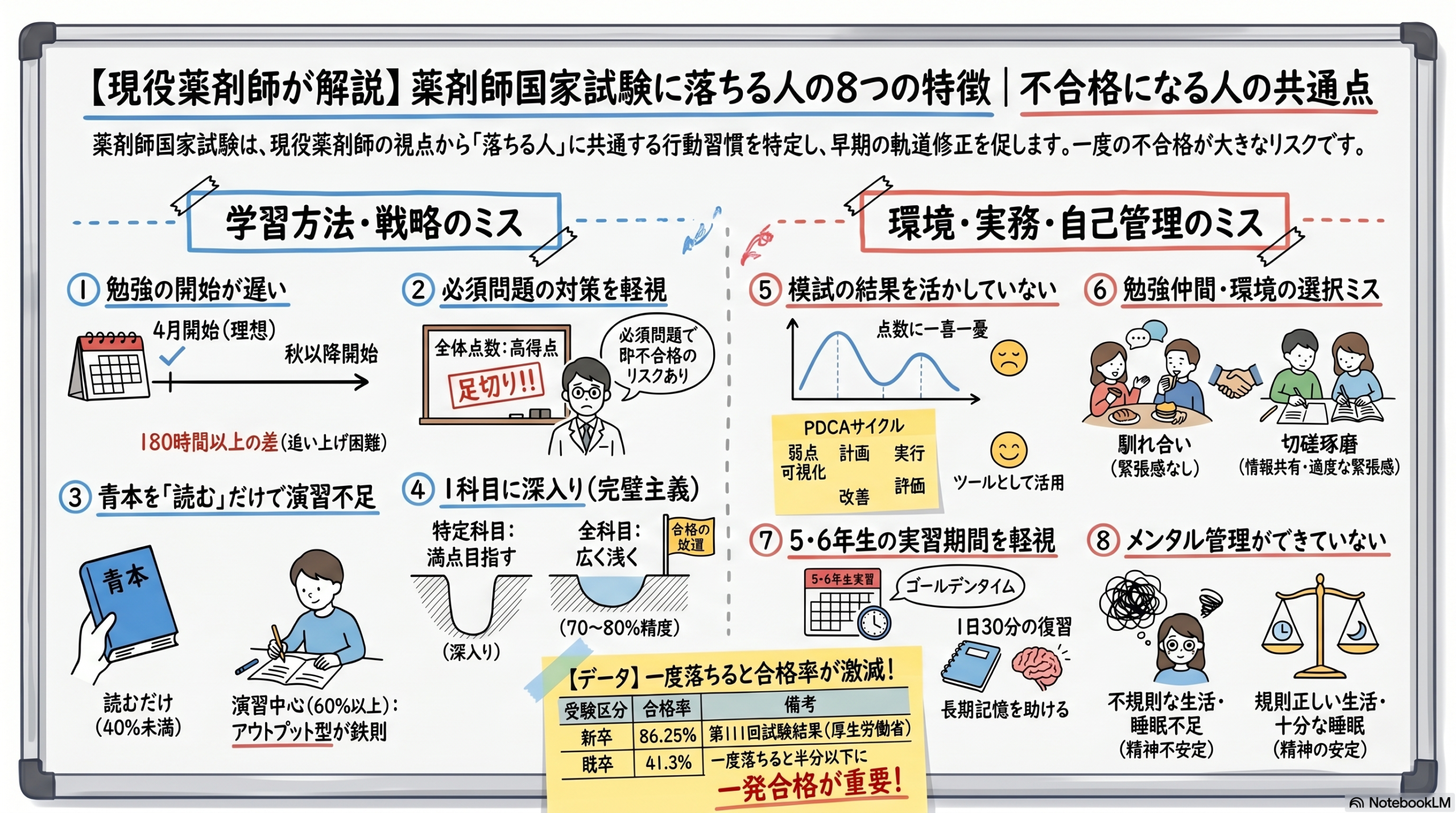 この記事では、ストレート合格した現役薬剤師の視点から、「薬剤師国家試験に落ちる人の共通点」を8つ徹底解説します。