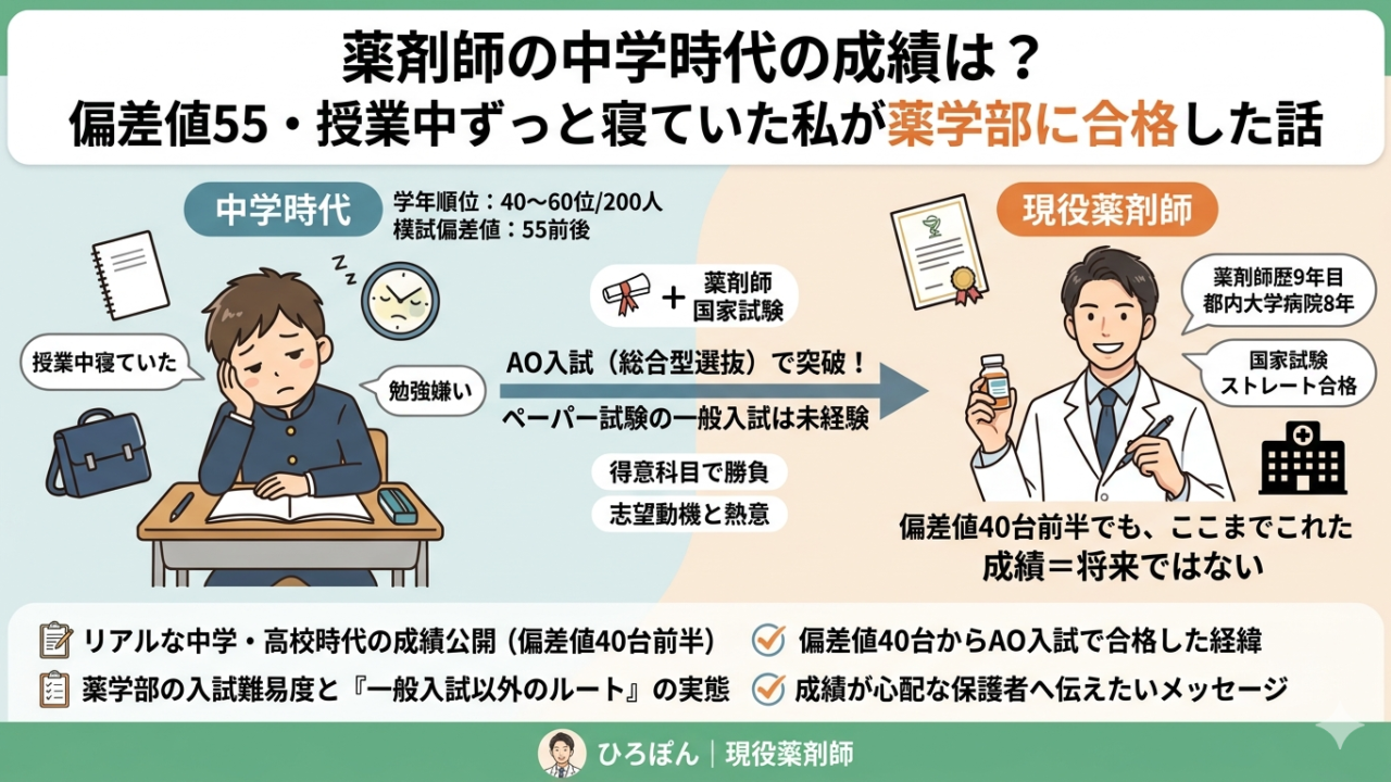中学で偏差値55、高校で偏差値40台前半。授業中ずっと寝ていた筆者が、国家試験をストレートで合格し、都内大学病院に8年勤務し、現在は北海道で企業薬剤師として働いています。「成績=将来」ではないことを、この経歴が示していると思っています。