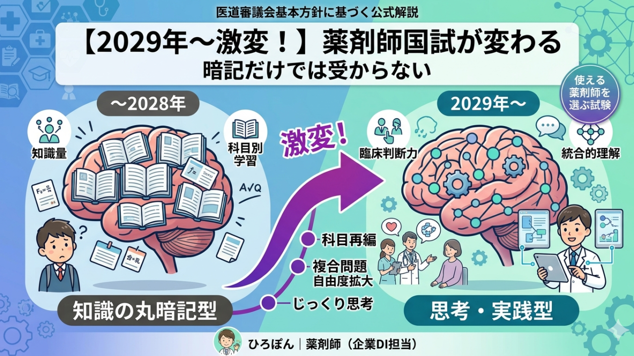 薬剤師国家試験が、2029年(令和11年)実施の第115回試験から大きく変わります。試験科目の再編・複合問題の自由度拡大・出題数の削減など、変更点は多岐にわたります。