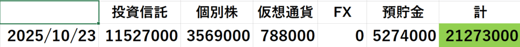 この間、私は会社からの給与収入(手取り26万円)しか得ていませんので、資産が勝手に増えた結果、最近の上昇相場の波に乗り一気に2100万円に到達しました。(高市効果?)