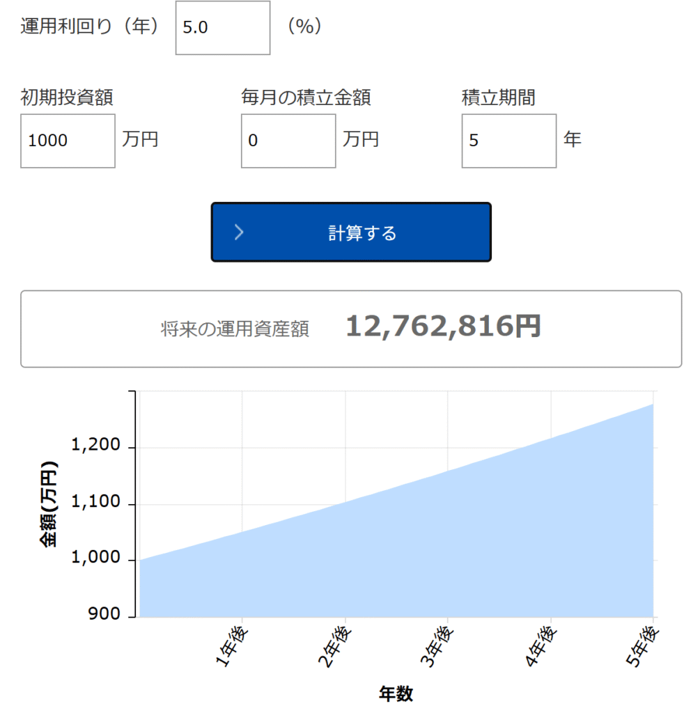 1000万円を年利5%で運用した場合、追加投資なしでも5年で276万円も増えます(皮算用)