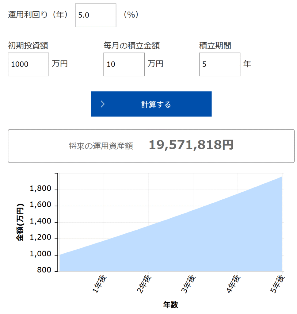 さらに毎月10万円を積立できた場合は5年で約2000万円に到達できます。